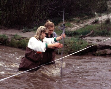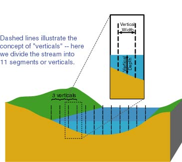 The previous page shows us that streams have complicated channels with deep pools and shallow riffles. In a real stream the channel's cross section can be quite complicated. How do we measure discharge where the channel geometry is complicated? We divide the stream into several smaller sections called verticals. Each vertical has its own depth, width, and velocity. Below is a diagram showing verticals for a stream and students measuring water velocity in the middle of a vertical.